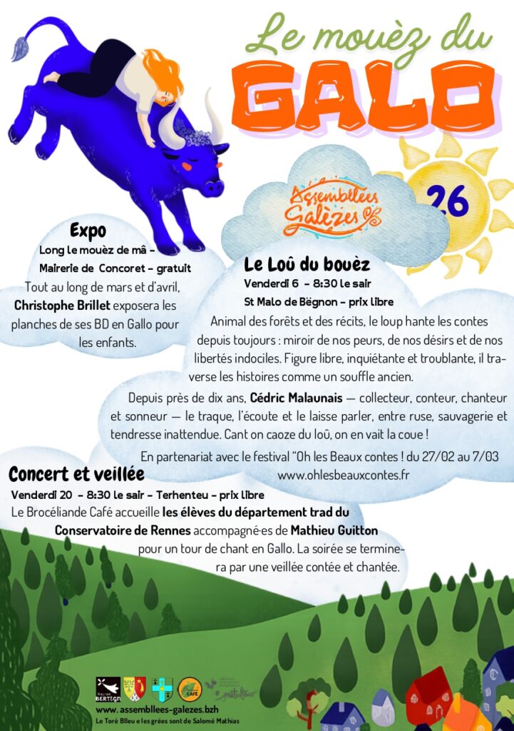 6 mars 2026, 20h30, salle des fêtes Saint Malo de Beignon Cédric Malaunais Le Grand loû du bouèz, Conte de traditions orales en gallo, avec musique et chants collectés en Haute Bretagne sur le thème du loup. Ce sera également l’occasion de mettre en avant la sortie prochaine de son disque compilant une partie de ce répertoire. Cant on caoze du loû, on en vait la coue !